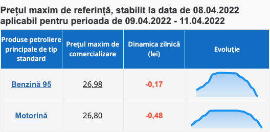 Potrivit ANRE, în următoarele trei zile, un litru de benzină cu cifra octanică A 95 va costa 26 de lei și 98 de bani, cu 17 bani mai puțin decât în ziua precedentă, iar un litru de motorină va costa 26 de lei și 80 de bani, cu 48 de bani mai puțin comparativ cu ultimii indici.