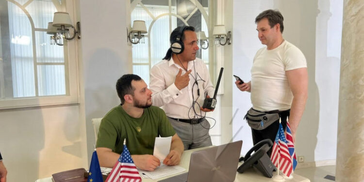 În regiunea ocupată Lugansk din estul Ucrainei, rușii fac un film despre război, în care folosesc toate simbolurile pe care propaganda de la Moscova le atribuie ucrainenilor: că sunt naziști, că sunt conduși de americani, că ascund biolaboratoare în care se produc virusuri mortale.