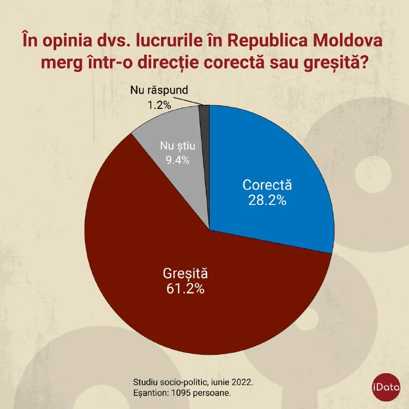 Republica Moldova se îndreaptă într-o direcție greșită. O spun 61,2% din respondenții sondajului realizat de iData (Date Inteligente SRL), făcut public miercuri, 29 iunie.